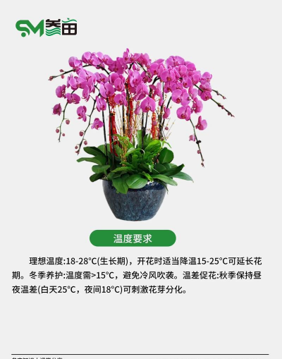 温度是养护蝴蝶兰的关键因素之一。蝴蝶兰生长适温为18~28℃,但在夏季,室内温度往往都在30℃以上,养护时,可将蝴蝶兰置于通风半阴处,有利于其度过酷夏。蝴蝶兰需低温才能促进花芽分化,一般20℃以下均可达到催花的目的,但冬季室内温度有时低于10℃,不利于蝴蝶兰生长,可将蝴蝶兰置于阳光充足的窗台等处或放在加温设备附近以提高温度。