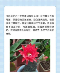 令箭荷花(也称作“令箭”)是一种常见的观赏植物,通常在春季开花,花期较短。如果令箭荷花不开花,可能是由于多种因素导致的,以下是常见的原因及解决方法: