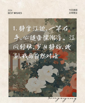 “钓竿轻摇,水波荡漾,花影摇曳,仿佛自然与艺术在此交汇。每一帧都是一幅静谧的风景画。”