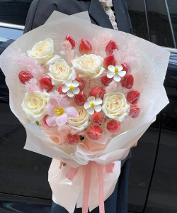 草莓花束在保存时应保持干燥,避免潮湿环境导致花期缩短。可以将花束放在通风良好、阴凉处,避免阳光直射。