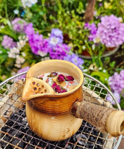 “庙会养花,添喜气;做饭美味,增福气。愿您生活如花般绚烂,如食般丰盛。”