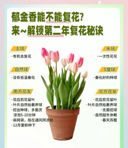 郁金香是多年生草本植物,具有较强的观赏价值,复花(即再次开花)需要适当的养护管理。以下是郁金香复花的关键养护方法: