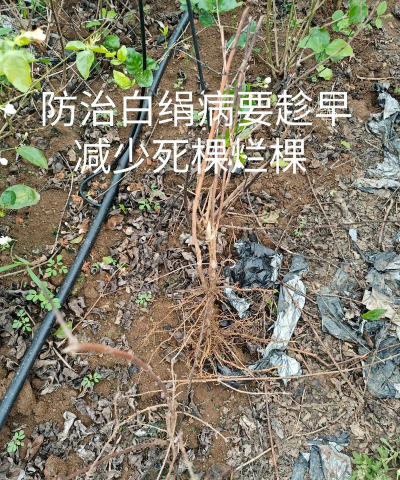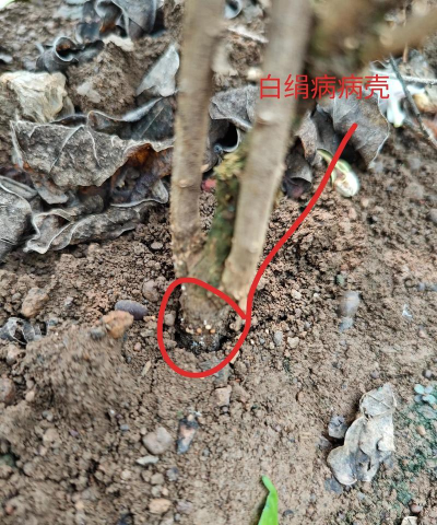 发生在根颈部,病部初呈褐色斑,表面生白色绵毛状物,扩展后绕根颈一圈,形或白色绢丝状菌膜,可向土面扩展。后期在病部形成油菜籽状菌核,由白色转黄褐色至黑褐色。由于病菌的致病作用,病株皮层腐烂,水分、养分运输受阻,叶片枯萎、脱落,最后全株死亡。
