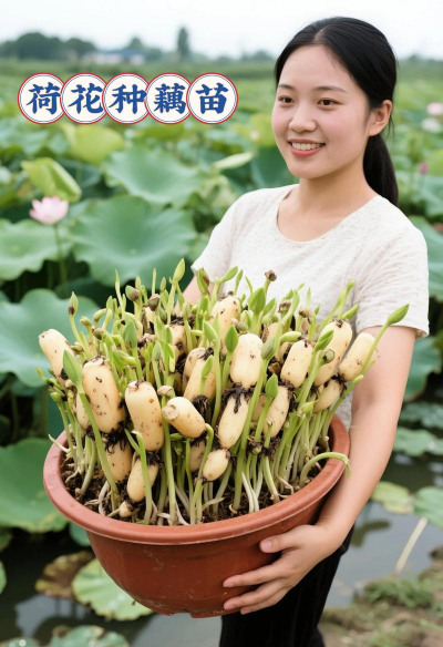 2、分藕繁殖:3月中旬至4月中旬是翻盆栽藕的最佳时期。过早栽植会有寒流影响,种藕容易受冻害。北方地区遇寒流时可用透明农膜覆盖。栽插前,盆泥要和成糊状,栽插时种藕顶端沿盆边呈20度斜插入泥,碗莲深5厘米左右。大型荷花深10厘米左右,头低尾高。尾部半截翘起,不使藕尾进水。栽后将盆放置于阳光下照晒,使表面泥土出现微裂,以利种藕与泥土完全粘合,然后加少量水,待芽长出后,逐渐加深水位,最后保持3—5厘米水层。池塘栽植前期水层与盆荷一样,后期以不淹没荷叶为度。