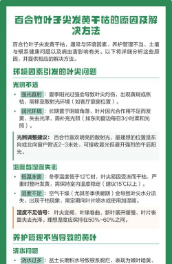 百合叶尖干枯的原因复杂,建议从浇水、土壤、施肥、光照、温度等方面综合判断。优先保持土壤湿润、排水良好,合理施肥,避免病虫害侵袭,确保百合健康生长。