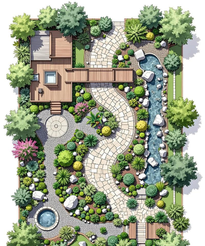- 自然式布局:模仿自然地形,利用植物和水体形成自然景观,如溪流、树林、草坪等。
