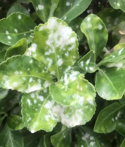 主要发生在叶两面,叶面多于叶背,叶两面初现白色稀疏的粉斑,后不断增多,常融合成片,似绒毛状,严重的布满全叶,后期常现黑色小粒点,即病菌闭囊壳。
