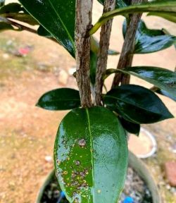 山茶花藻斑病又称白藻病,由寄生性锈藻(Cephaleuros virescens)引起。发生严重时可造成山<0>感病叶片大量发黄脱落,使新梢细而短,新叶小而少,严重影响树势,甚至全株死亡。
