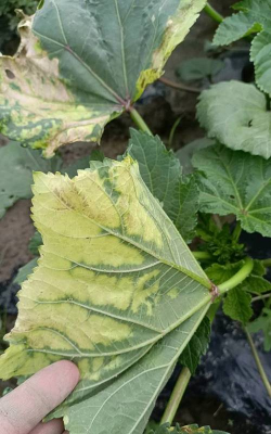 病毒病是黄秋葵生产上主要病害,根据我县种植调查成株期比苗期病重。发病时间一般在5~9月。植株染病后全株受害,尤其以顶部幼嫩叶片十分明显,叶片表现花叶或褐色斑纹状。早期染病,植株矮小,结实少或不结实。