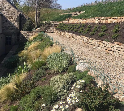 - 花盆排列:花盆沿斜坡排列,形成一个阶梯状的花床。