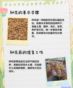 1. 选择适合的花卉品种根据气候和光照选择花卉:如阳光充足的地方可种植向日葵、玫瑰、郁金香等;阴凉处适合绣球、蕨类、常春藤等。根据季节选择花卉:春季可种郁金香、风信子;夏季可种向日葵、向日葵、茉莉;秋季可种菊花、百合;冬季可种仙人掌、多肉植