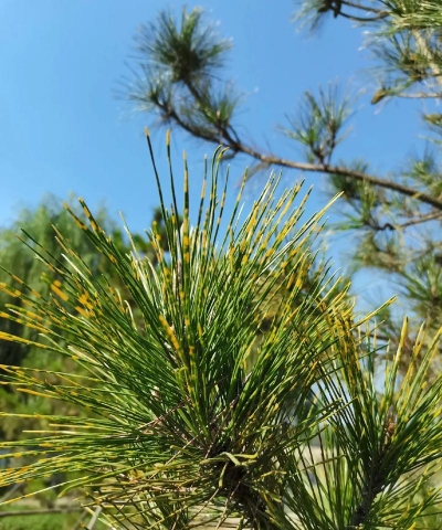 松针病初产生淡绿色小斑,后产生黄褐色丘状突起,常排成一行,这是病原锈菌的性孢子器。春季在丘疹状的性孢子器的对侧,产生由黄白色变为桔黄色的疱囊,即病原菌的锈孢子囊。囊破后,散出黄色粉状的锈孢子,最终只剩下锈孢子囊的包被,白色膜状。待包被失去后,松针常常枯萎变黄褐色并早落,偶遇春旱时,病情虽然发展缓慢,但病树新梢生长受阻,2~3年后病株死亡。