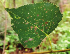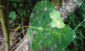 杨树灰斑病从小苗到大树均可发病,但以幼苗、幼树发病为重。被害寄主有小叶杨、小青杨、毛白杨、箭杆杨等树种。病害发生在叶片及嫩悄上。病叶上初生水渍状失绿斑点,逐渐变为边缘褐色中央灰色的近圆形病斑。遇湿灰斑上长出黑色毛状物,此为病菌分生孢子堆。嫩梢发病,迅速变黑枯死,又称“黑脖子”病。