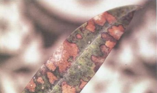 病原为真菌,链格孢(Alternaria sp.),分生孢子橄榄色,椭圆形,有纵横分隔,链状,着生在较长的分生孢子梗上。