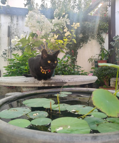 院子养鱼养花养猫