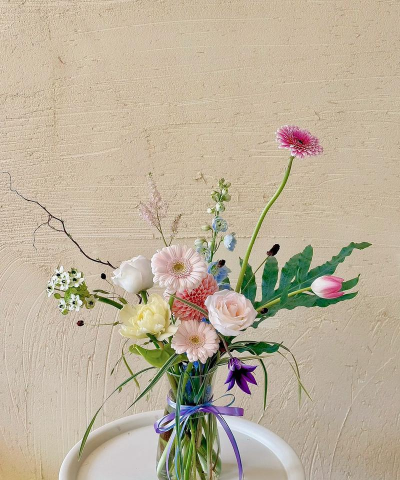 花束固定:使用花艺工具(如花艺夹、花艺绳)将花束固定在插瓶中,确保花束不会松动。