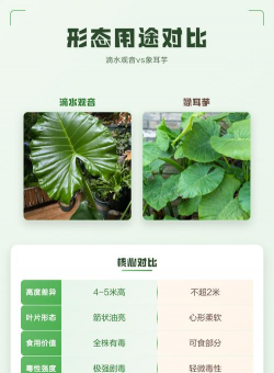 芋头和滴水观音在外观上有一些显著的区别,可以通过以下特征进行分辨: