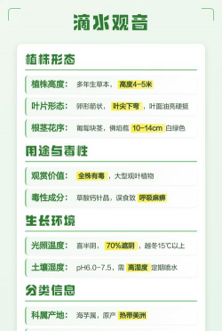 - 滴水观音:喜欢湿润的环境,适合在半阴或全阴的环境中生长,土壤需保持湿润但不积水。