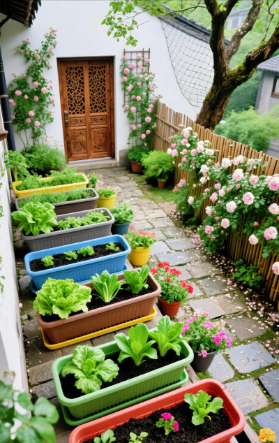 - 在庭院或小院中,可种植小型蔬菜和花卉,如番茄、辣椒、生菜等,使用小花盆或菜畦。