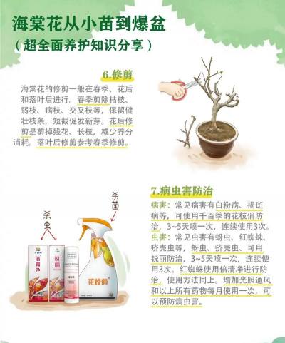 - 修剪:定期修剪枯枝、病枝和过密枝条,促进新芽生长。