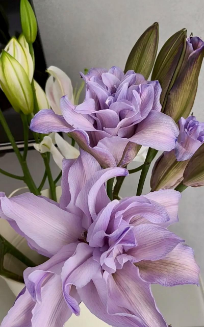 紫色花卉与白色花卉搭配,能形成清新、优雅的视觉效果。例如,紫色的玫瑰与白色的绣球花、百合搭配,非常经典。紫色与黄色搭配