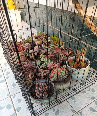 - 如果空间有限,可以考虑使用小型花盆或悬挂式花盆,放置在狗笼子旁边。