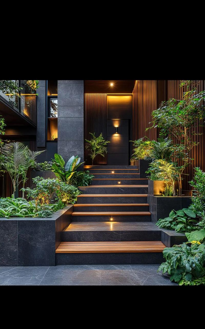 在花园中设计养花的楼梯,需要兼顾美观、实用性和植物生长的需要。以下是几种常见的楼梯设计方式及建议:
