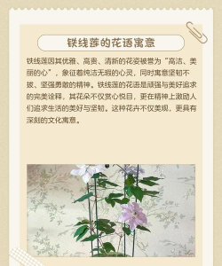 “铁线莲花语”这一说法并不常见,可能是指铁线莲的某种特性、寓意或文化含义。以下是一些可能的解释: