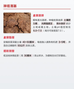 再看土壤与光照樱桃喜欢疏松的土壤,排水一定要好,如果土壤太黏,可以掺些沙子,光照要充足,每天至少6小时,这样果子才甜,如果光照不足,枝条会徒长,结果也少,所以,选址时要选向阳的地方。