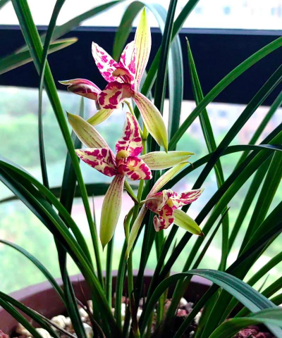 兰花喜欢散射光,千万别暴晒,放在明亮的窗边就好,夏天要遮阴,冬天可以多见光,温度要适宜,最好在15到25度之间,太冷或太热,它都会不舒服。