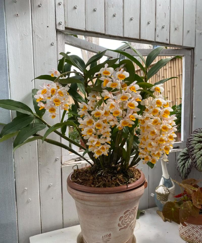 生长季节,球花石斛需要养分支持,可以每隔两周,施一次稀薄的液体肥,比如兰花专用肥,注意浓度一定要低,宁稀勿浓,到了秋冬季节,它生长变慢,就要减少或停止施肥,让它好好休息,平时也要注意通风,预防病虫害的发生。