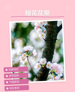 - 不同品种的樱花花期差异较大,例如早樱、中樱、晚樱等,花期从3月到5月不等。