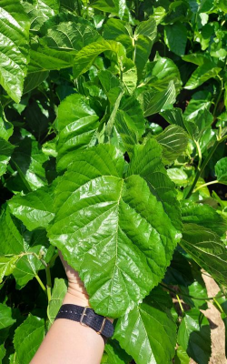 桑葚树叶通常呈深绿色,表面光滑,有轻微的光泽。叶片形状为长卵形或椭圆形,叶缘较钝,叶脉清晰。在生长季节,桑葚树叶较为茂密,颜色鲜绿;在冬季或休眠期,叶片会逐渐变黄或脱落。桑葚树叶含有丰富的营养成分,如维生素C、维生素A、蛋白质等,常被用作中药材或养花的绿肥。