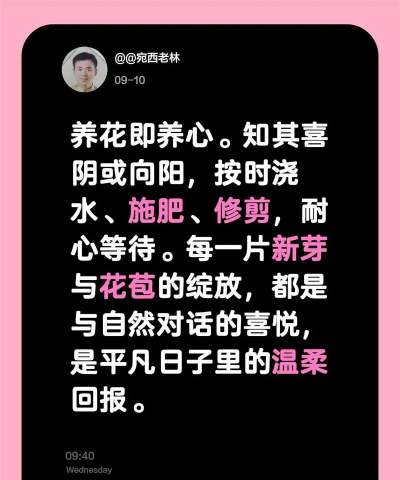 养花不仅是对植物的照料,更是一种心灵的滋养。在养花的过程中,人们可以感受到自然的和谐与生命的律动,从而达到放松心情、调节情绪的目的。以下是关于养花的一些实用建议和技巧,帮助您更好地享受养花的乐趣: