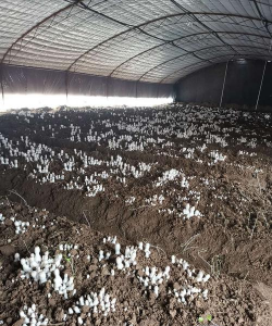 床载可节约成本,不要发菌室,只要管理得当,同样可获得高产。首先选好栽培场所(与上述出菇场相同),设置荫棚,挖宽150厘米、深20厘米的栽培沟。第二将发酵好的栽培料摊晾,分层铺于沟内,料厚15厘米,分三层播种,用种量为栽培料重量的15%。播后平整料面,稍加镇压,然后覆土4~5厘米,待菌丝长满覆土后,喷水湿润,上盖薄膜,保温保湿出菇。