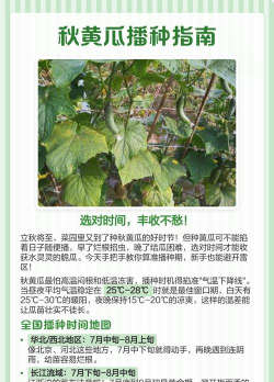 秋黄瓜是夏季播种、秋季采收的黄瓜品种,既能避开夏季高温多雨导致的病虫害高发期,又能在秋季蔬菜供应淡季上市,深受种植户和消费者喜爱。但秋黄瓜生长周期短,对温度敏感,种植时间过早易遇高温干旱,过晚则会因低温影响结果,掌握最佳种植时间是种好秋黄瓜的关键,下面详细介绍不同地区的种植时间及要点。