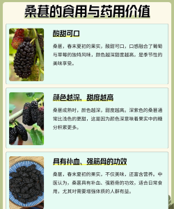 口感特征:成熟桑果酸甜多汁,果肉细腻无涩味;未成熟果实酸涩味重,果肉硬实;过熟果实甜度下降,果肉发黏,甚至有发酵味,不宜食用。