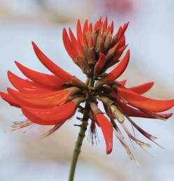 花朵:总状花序顶生,花密集且成对排列;花冠鲜红色,旗瓣大而显著(长5-6厘米),形似火炬或鹦鹉喙,故别名“鹦哥花”。花期多为3月,先花后叶或花叶同放,盛开时如“火伞烧空”,极为壮观。