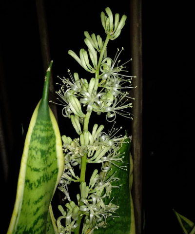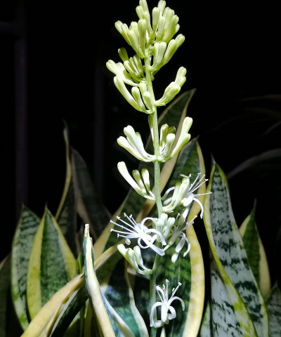总结 :虎皮兰开花以白色/淡绿色为主,花朵小巧密集,香气浓郁,花期持久,是兼具观赏与寓意的室内植物。
