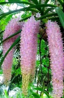 菲律宾热带雨林特有,花朵呈蓝紫色爪形,垂挂如葡萄串。因栖息地破坏濒临灭绝,需特定土壤条件才能生长。