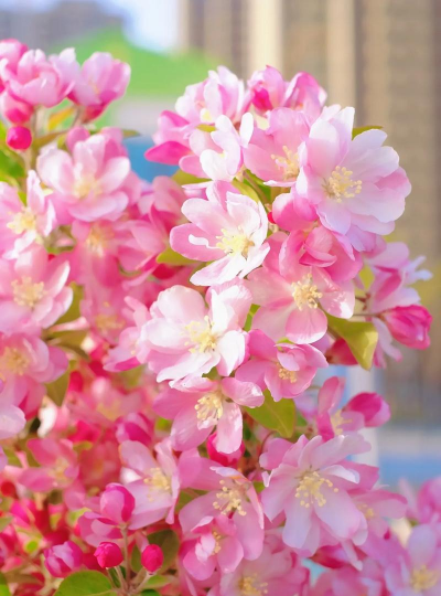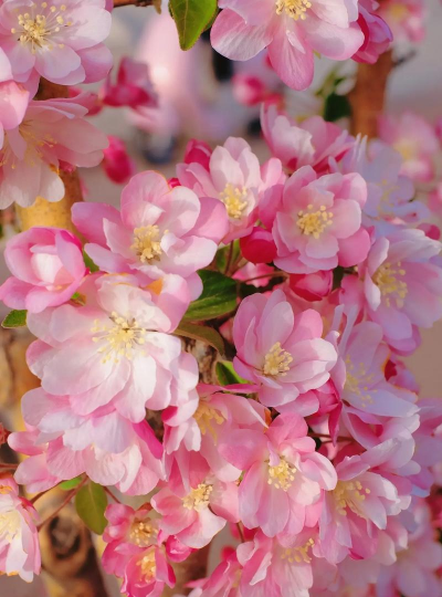 海棠:红色或粉色,如垂丝海棠花朵下垂,花梗较长。