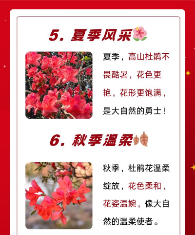 春鹃:通常在4月下旬至5月上旬开花,代表品种如“映山红”,花色丰富,包括大红、深红、紫红等。