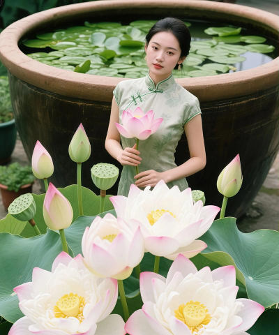 若以观赏为主,可选择直径30cm左右的浅盆种植碗莲品种,如『金陵凝翠』。