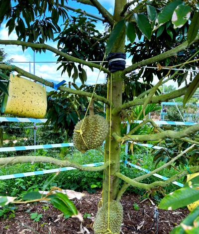 榴莲树需3-5年结果,结果后需疏果、修剪树冠以促进果实发育,最终年产量较低但品质稳定。