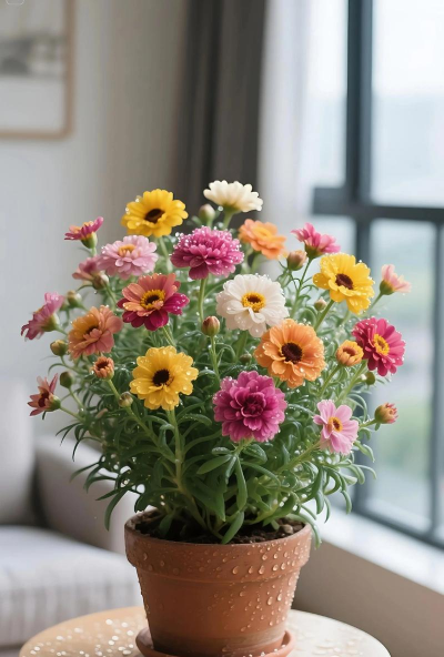 长春花耐晒且花期极长,可从春季持续开放至秋季。适合放在阳光充足的窗台,花色多样,易于养护。