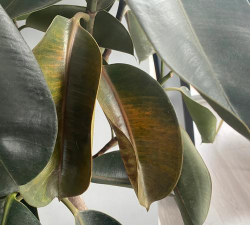 叶面深绿色,表面油亮有光泽,部分品种(如金边橡皮树)叶缘呈金黄色,或带有黄白色斑纹。