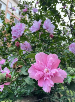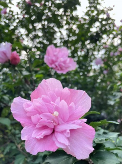 重瓣型:花瓣多层,形似牡丹,如‘牡丹木槿’(‘Paeoniflorus’),花粉红色或淡紫色,花径7-10厘米,花期长。