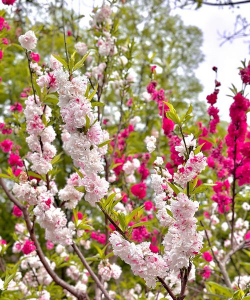 花色与树形:观赏桃品种丰富,如垂枝碧桃(枝条下垂)、帚型桃(枝条直立)、曲枝桃(枝条扭曲)等,花色还有红白混色(如五色碧桃)或绿色(绿花桃)。