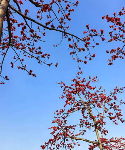 花朵呈 红色或橙红色 ,直径较大(约10厘米),花瓣肉质且分五片,盛花期树形壮观,常用于城市景观和公园绿化。