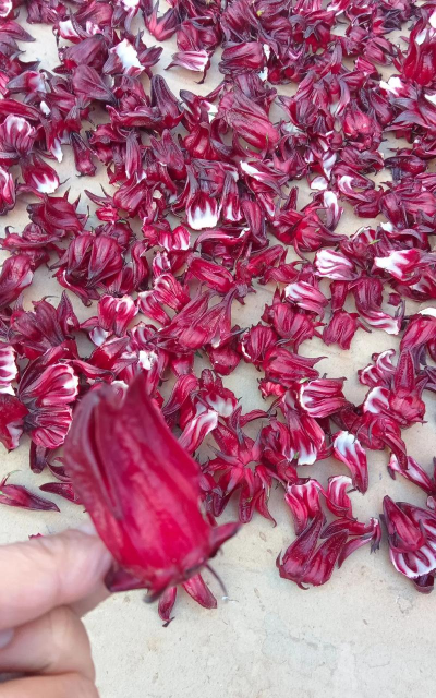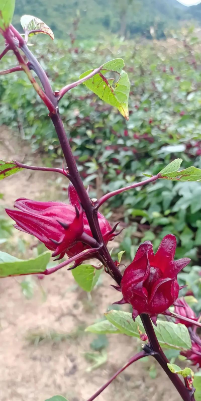 洛神花本身为锦葵科木槿属植物,花朵呈红色,生长在叶腋下,果实类似玫瑰但属茄科。